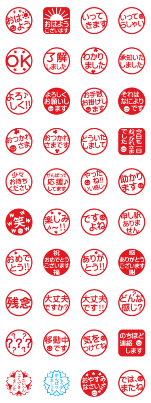 日常よく使う言葉を厳選!大きな文字(でか文字)で見やすく読みやすいハンコ風スタンプです。日常使いに便利で初心者の方にもお勧め!一つあれば便利な定番セットです。