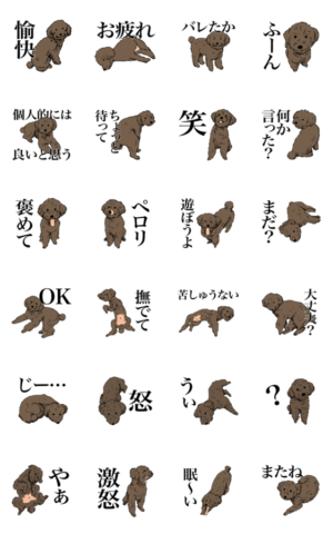 可愛いトイプードル(ブラウン)の日常で使いやすいゆる〜いセリフ付きのスタンプです。姉崎信 より発売