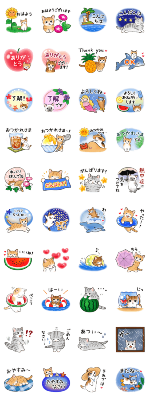 ねこたちのスタンプです。毎日使える基本のメッセージが多めのセットです。夏にぜひ♪(敬語/かわいい)