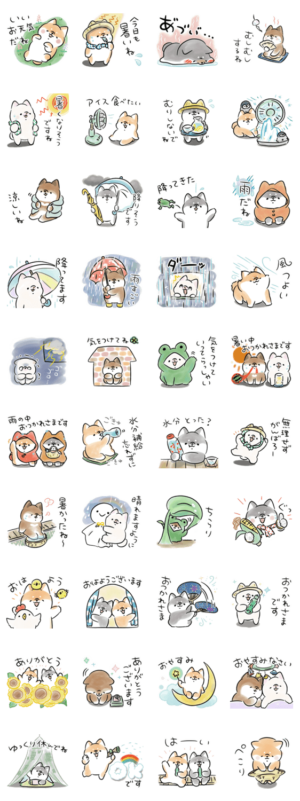 春から夏にかけて毎日使える、柴犬のお天気スタンプです。基本のあいさつも入っていますmimori より発売