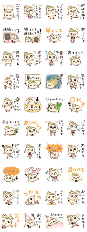 ほぺ美ちゃんシリーズ!キュートな主婦さん・ママのスタンプです♡家族に使いたいセリフを沢山詰め込んでいます♪小さな幸せ/感謝あさごぱん より発売
