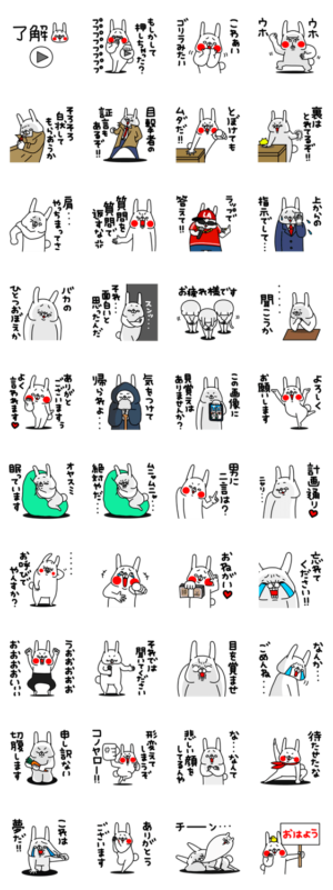 全力でうざい全力でおちょくるあざとかわいいうさぎのおふざけが止まらない!刑事・ラッパー・サラリーマン・侍などに扮しておおいにふざける使いやすいお調子者スタンプ。