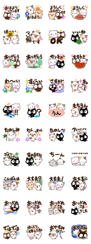 『ちびミケ』の三毛猫や『クロネコすたんぷ』の黒猫等、『シロネコすたんぷ』『ちびブチ』のぶちねこ等『かたこ』作成のねこたちの、夏の雰囲気のスタンプです。かたこ より発売