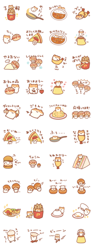 すやはむの食べ物スタンプ第二弾!ハンバーガーやポテト、チャーハンなどに紛れたはむちゃんが盛りだくさんのスタンプです。すやお より発売