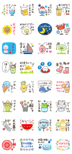 挨拶や敬語がメインの使いやすい基本セット。夏にぴったり!大人可愛い元気カラーのスタンプです★見やすい大きめ文字。シンプルなので老若男女問わず使えます。