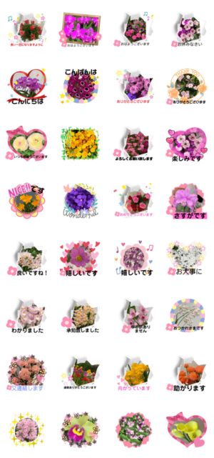 毎日使える挨拶を美しい花束を添えて贈るスタンプです。丁寧な言葉使いにしました。お花も蘭や薔薇が多くなっています。是非ご活用ください。Blue Sky より発売
