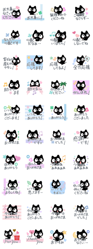 『クロネコすたんぷ』の【絵文字】と【着せかえ】もあります。やさしい言葉や励ましの言葉等がいっぱいのちいさい黒猫スタンプ。可愛いくろねこ好きな方にぜひ。【かたこ】