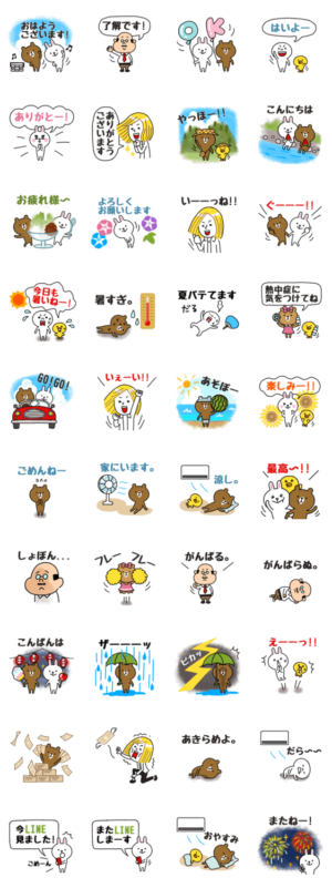 LINEフレンズ夏バージョンです。 ブラウン、コニー、サリー、ムーン、部長、ジェームズ、チョコ ※BROWN & FRIENDS をみんなでつくろう!キャンペーン参加スタンプですm-coffee より発売