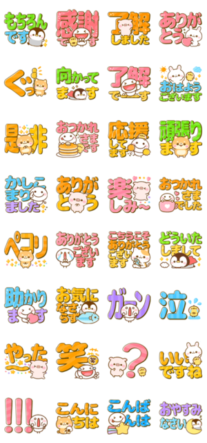 大集合♪棒人間、ぺんぺん、ほいっぷ、豆柴日和、ねこにゃん、ぽこちゃんのとってもカラフルなデカ文字スタンプです。犬・猫・うさぎ・ペンギンぴよたぬき より発売
