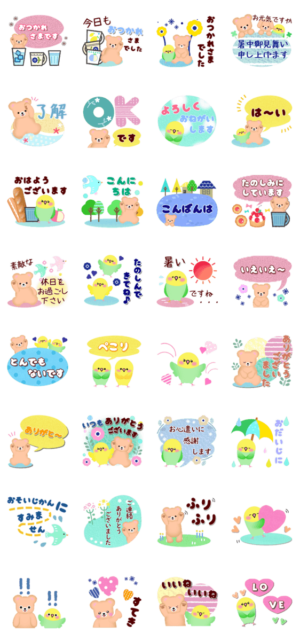 【夏】北欧スタンプ/クマ/熊/インコ/鳥/海/ほんわか/かわいい/挨拶/了解/ありがとう/よろしく/お大事にしてください/mamama-chin
