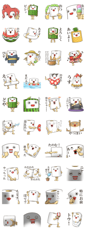 少し生意気なトイレットペーパーの夏モノ多めのスタンプです。ねくたいねこ より発売