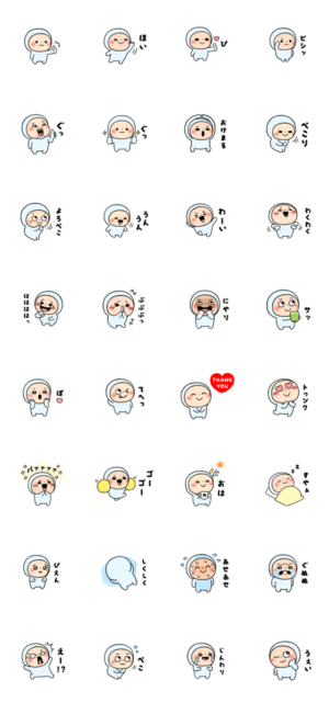 「ぐっ」「ぺこり」「うんうん」「ビシッ」「わくわく」「はははっ」「てへっ」「ぱぁぁぁ」「にやり」「えー!?」などのシンプルなオノマトペ(擬音)スタンプ第2弾です。