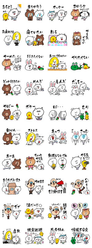やる気のないスタンプばっかりだよ。でも時々少しやる気出してるよ。あ〜あ〜やだよ〜って時に使ってね。