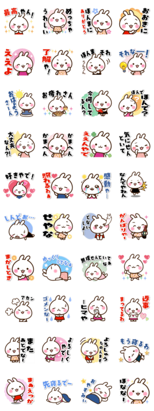 うさぎさんの関西弁スタンプです♪思いやりのある優しい言葉のスタンプです。 大阪弁/京都/兵庫/滋賀/奈良/和歌山マキたん より発売