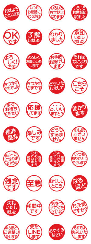 よく使う敬語・丁寧語を厳選!大きな文字(でか文字)で見やすく読みやすいハンコ風スタンプ!先輩や上司等に便利でビジネスにもお勧め!一つあれば便利な定番セットです。ケイ&エイセイ デザイン より発売