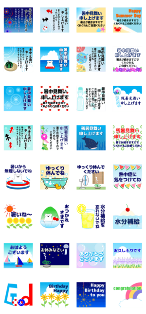 暑中お見舞い申し上げます、残暑、夏のあいさつ。熱中症注意、水分補給、暑いので無理しないでね等 気づかいスタンプも。プラス バースディーカードや日常会話なども