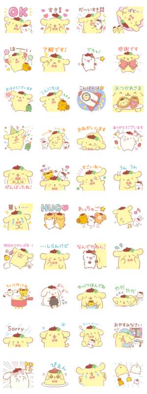 ポムポムプリンの文字入りスタンプです。明るくて楽しい雰囲気のスタンプをラインに飾ってトークを盛り上げましょう!