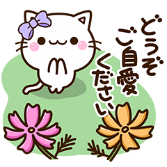 リボンをつけた小さい白猫『ちびシロ』。よく使うあいさつや、相手を思いやる言葉等、便利なネコスタンプです。しろねこ好きな方にぜひ。【かたこ】かたこ より発売