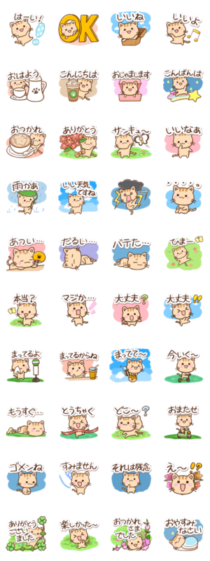 色鉛筆で描いた『やさしいトラネコ【日常&待ち合わせ】』編。毎日よく使う言葉などを集めた猫スタンプです。ねこ好きの方にぜひ。※背景を描き加えた再販版です【かたこ】