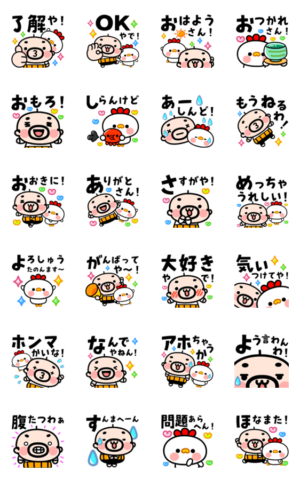 おやじ君とかわいいニワトリ君の飛び出す大阪弁スタンプ!毎日使える定番の関西弁挨拶スタンプがそろってます♪