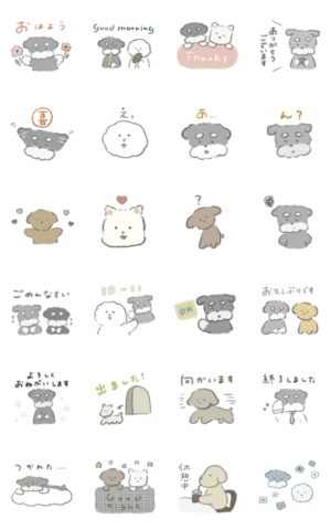 シュナウザーやその仲間達のプードル、ビションフリーゼ、ウエスティなどの日常で使いやすいスタンプです♪ 犬/シュナウザー/手描き/かわいい/ほっこり/日常/使いやすい