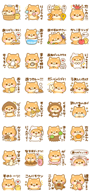 豆柴日和♡ 使いやすい言葉がいっぱいのダジャレスタンプです。ぴよたぬき♡ より発売