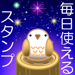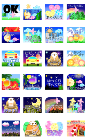 おはよう、ぺこり、お疲れ様、などよくつかう挨拶を集めたスタンプです。夜空と☆のスタンプ多めです。パステルな鳥、魚とマンボウ、フクロウなどのキャラが登場します。