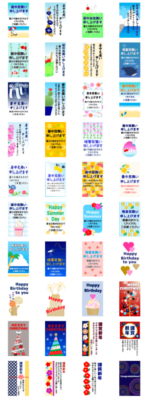 大きなサイズで見やすく分かりやすい挨拶文付き暑中見舞い、残暑見舞い、バースディーカード、年賀状。色々なタイプの絵柄。大人の丁寧でやさしい敬語、猛暑の気遣い