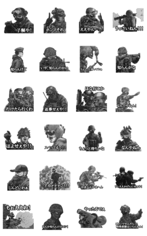 筆ペンで描かれた軍事スタンプ。関西弁で喋るサバゲーマーのスタンプ。方言、サバイバルゲーム、自衛隊、米軍などに興味がある人向け。あんこ より発売