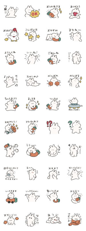 よく使うフレーズを集めたうさぎときどきにんじんシリーズのスタンプです。使いやすい/シンプル/白いうさぎ/かわいい