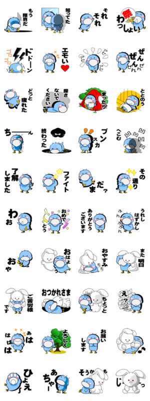 小さなハシビロコウのコウちゃんの楽しくて毎日使いたくなっちゃうスタンプです。 大好きなウサギのぬいぐるみと共に。