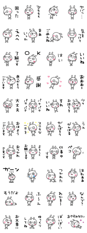 ふんわかウサギのポップタッチ風。「大丈夫」「おおお〜」から「ばいばーい」まで。気軽に楽しく、毎日メッセージを伝えよう。家族、学校、お仕事でも。