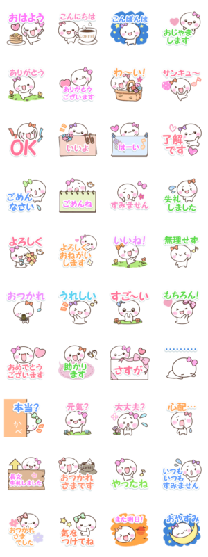 リボンを付けた可愛い『しろりぼん』のカラフルで明るい雰囲気のスタンプです。誰でも使える、かわいいスタンプです。白くてまるいキャラクター好きの方にぜひ。【かたこ】