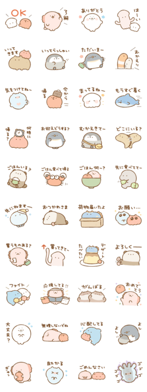 海や川に暮らすいきものたちの、家族やカップル、友達同士の連絡で使えるスタンプです。メンダコ、タコ、イカ、ペンギン、アザラシ、ウーパールーパー、ラッコなど