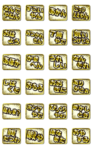 画面上に飛び出す金文字の2枚のパネルが激しく交互にスライドするポップアップスタンプ第二弾です、おはようからおやすみ、よく使う言葉を関西弁で激アツに伝えます