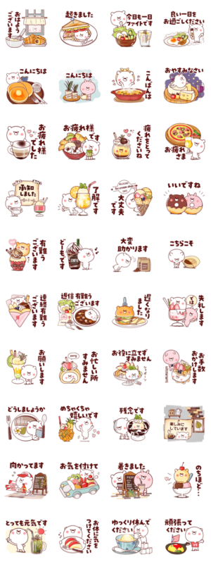 毎日使える日常会話、挨拶、良く使う言葉の敬語を詰め込みました。スイーツ、ファストフード、ドリンクなど食べ物いっぱいカフェ風の可愛いスタンプです。あぢゅ より発売