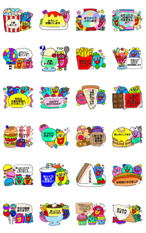 お菓子やジャンクフード、スイーツなどかわいいカラフルなメッセージスタンプ。文字は自分が好きな言葉を自由に入れられる!日常会話や仕事どんな場面でも毎日使えます♪ 現在この商品は一部のスマートフォン版LINE 10.3.0以上のトークルームでのみ使用できます。動作環境の最新情報はヘルプをご確認ください。Rienbow より発売