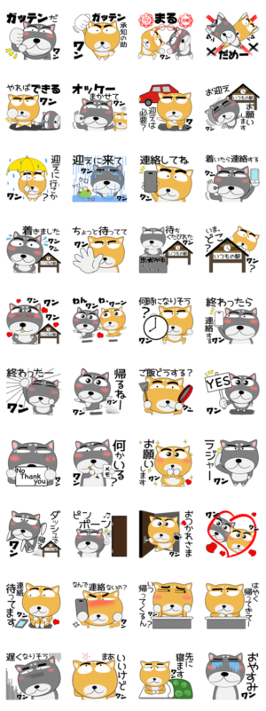 まゆ毛が愛らしい柴犬と黒柴のスタンプ。毎日よく使う言葉が勢ぞろい。家族、カップル、夫婦にお勧め。帰るコール、お迎えのお願い、待ち合わせなどで大活躍。わん、わん。