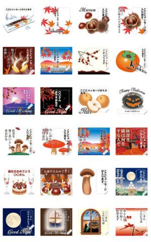 書き込める秋のタンプ。 秋、誕生日、挨拶。 サンマ、栗、焼き芋、松茸、ギンナン、カボチャ、梨、紅葉、赤とんぼ 現在この商品は一部のスマートフォン版LINE 10.3.0以上のトークルームでのみ使用できます。動作環境の最新情報はヘルプをご確認ください。yururi より発売