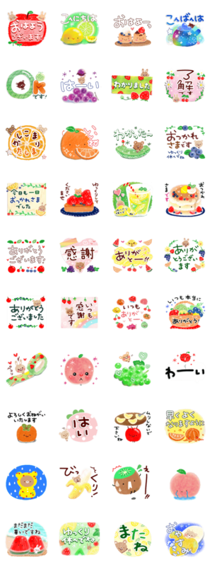 フルーツがいっぱい♪さわやかな日常挨拶スタンプセットです。 丁寧・敬語メインで、グループトークにもおすすめです。~果物・くま・うさぎ~ようこ より発売