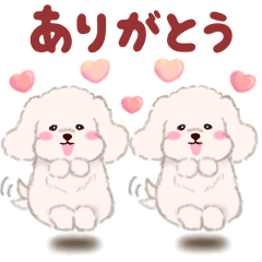 双子の白いトイプードルの日常よく使える言葉を集めたスタンプです。めぐみん より発売