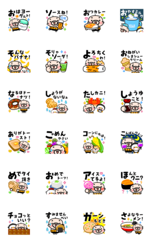 おやじ君の食べ物ダジャレの動くスタンプ登場!愉快なダジャレで挨拶と返事はいかが?柴犬、猫、ペンギン、ニワトリ…かわいい動物たちも一緒の楽しいスタンプです♪前田ムサシ より発売