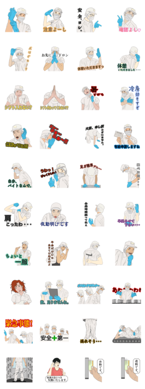 食品工場でのバイト経験を元に制作しました。職場への連絡から日常会話まで幅広く使用できます。"安全ヨシ"など現場での掛け声やライン作業あるある、溜まった不満も少し。