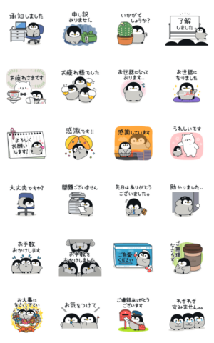 丁寧な敬語なので、家族や友人はもちろん目上の方やお仕事・ビジネス用にも使いやすい!ペンギンの赤ちゃんたちのかわいいポップアップスタンプ♪