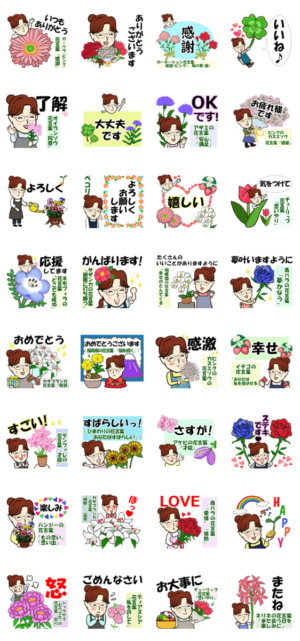 花言葉が載っていて便利で楽しく使えるラインスタンプ。よく使う言葉と挨拶付き。笑顔の女性のキャラで感じよく。花屋、お花モチーフ、デカ文字、ガーデニング、園芸、植物