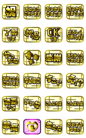 トーク画面の背景から金文字が飛び出る勢いで拡大ループするインパクトのあるデカ文字エフェクトスタンプです、おはようからおやすみ、よく使う言葉を中心に送れますハッピーリンク より発売
