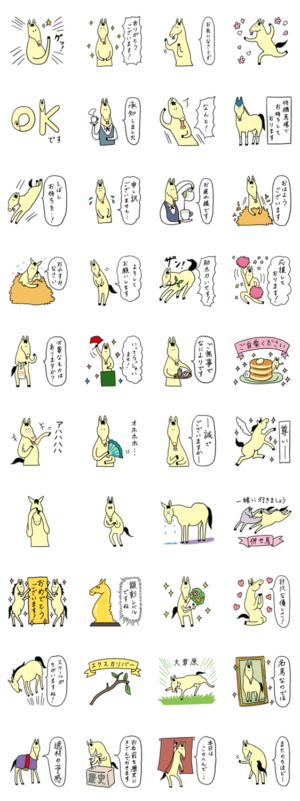 ゆるやかな敬語のスタンプです。あいさつ・褒め言葉が豊富な、毎日使いやすいシンプルなスタンプです。競馬・乗馬・馬好き同士の会話にも、そうでない人にもぜひどうぞ。
