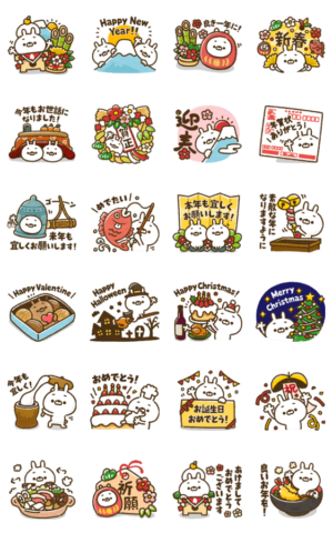 人参うさぎの年末年始がポップアップスタンプで登場!その他毎年使える色んなイベント、お祝い事スタンプも入ったお得なセットです!※年末年始イベントの再販となります
