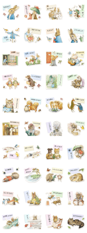 ピーターラビットの世界に登場する動物たちが、丁寧なことばで気持ちを伝えてくれるあいさつスタンプです。