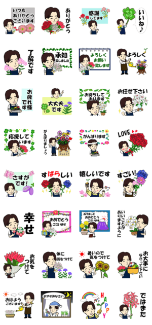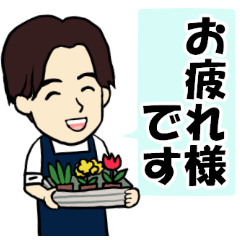 花屋さんで働く男性店員のラインスタンプ。お花や植物が好きなガーデニング男子にもおススメ。普段よく使う言葉や挨拶が敬語中心でたくさんあり、接客にも便利。デカ文字。dokukinoko より発売